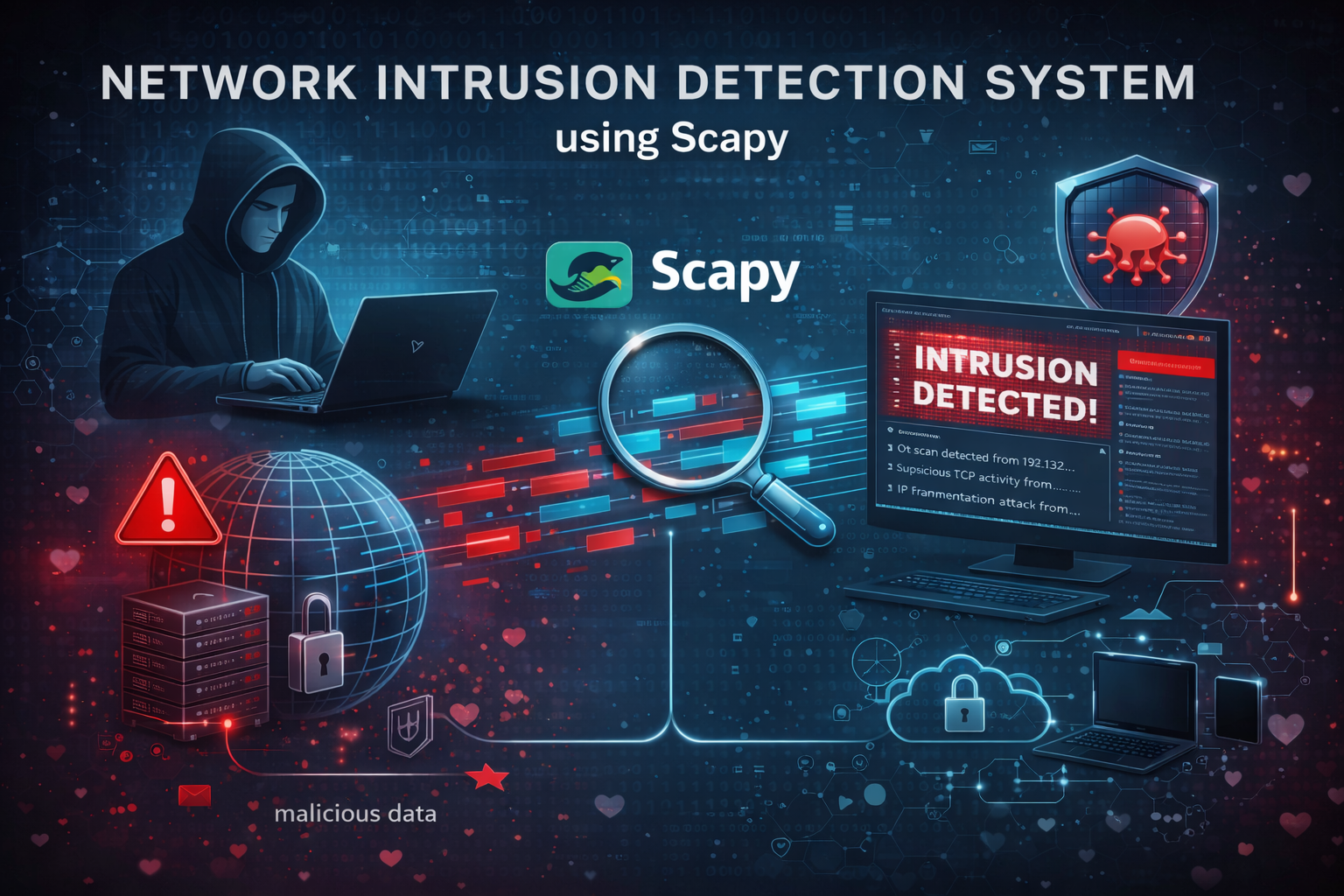 A Python-based system that monitors live network traffic, analyzes packets in real time, and detects suspicious or malicious activity using Scapy
